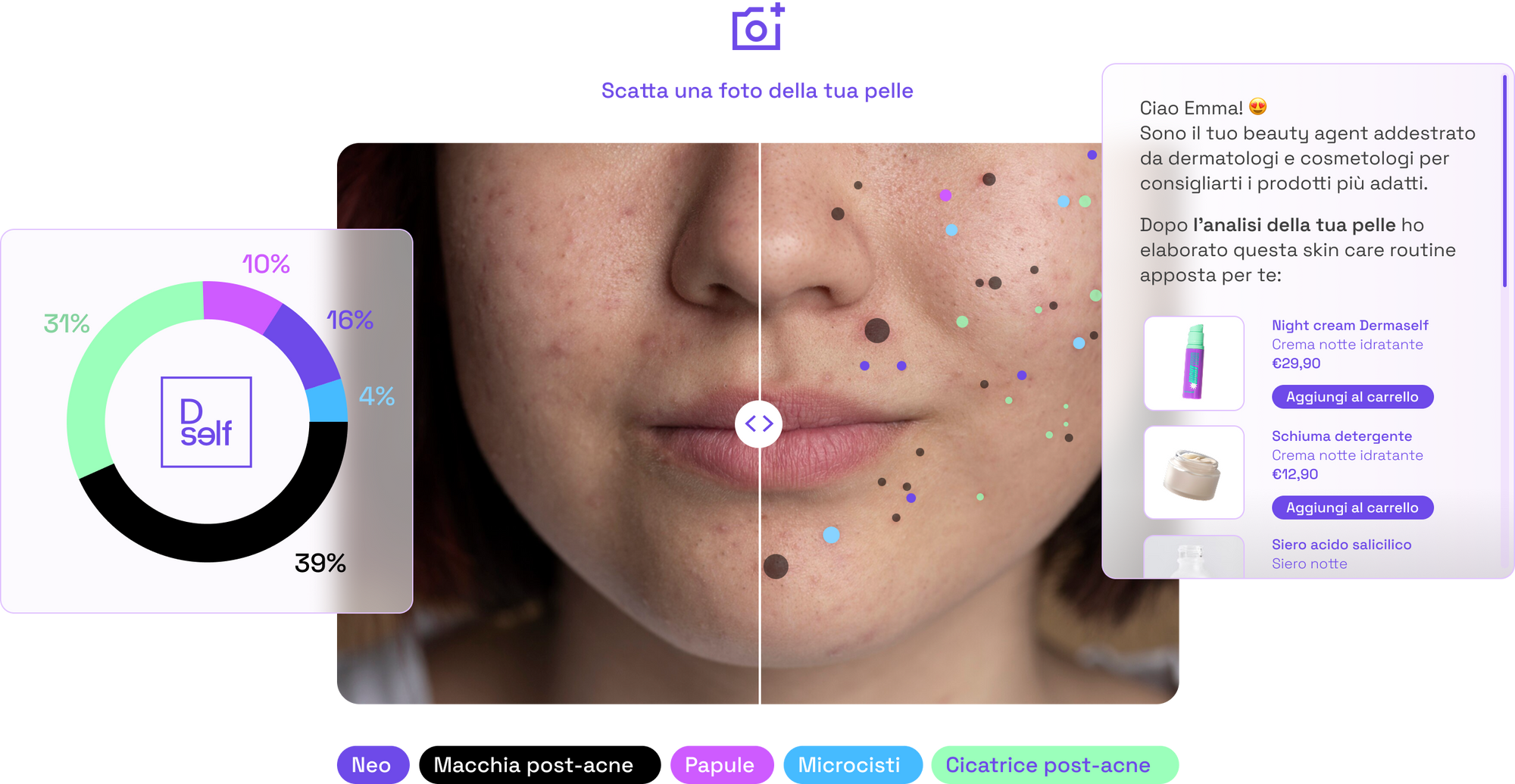 L’AI Beauty Agent Dermaself aiuta i tuoi clienti ascoprire i bisognidella pellepartendo da un semplice selfie.